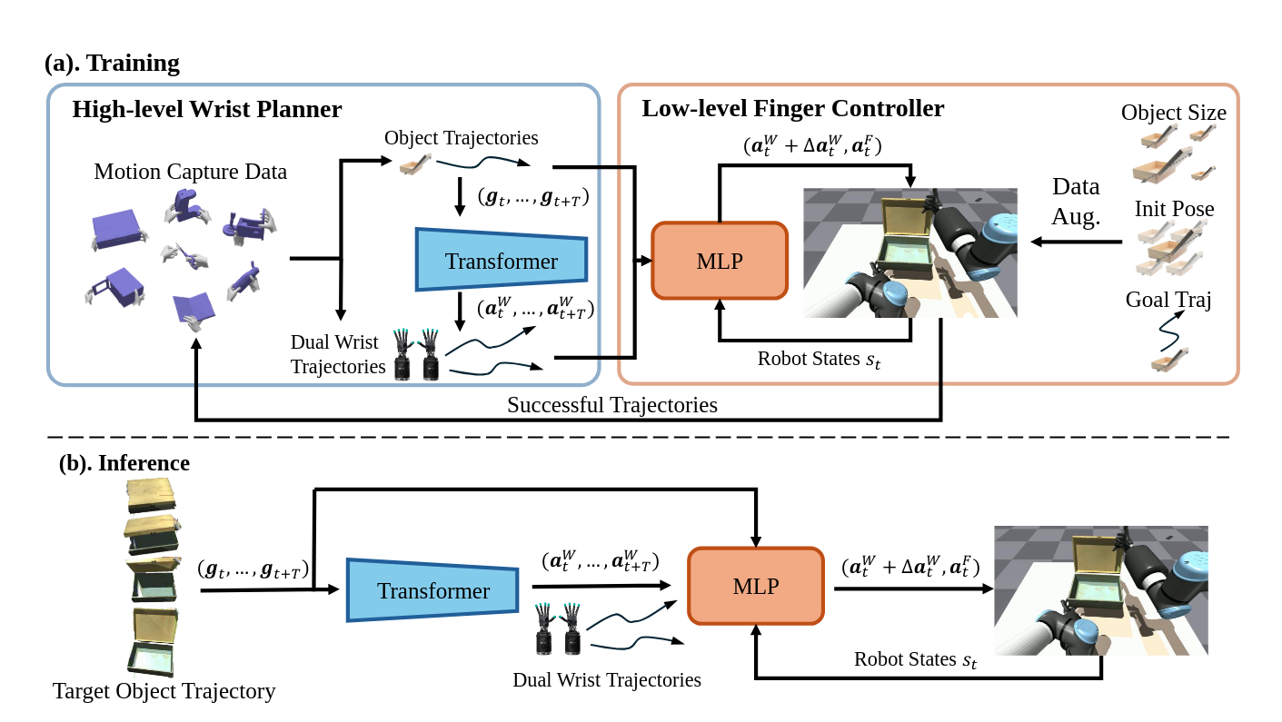 - High-Level Wrist Planner: A Transformer-based generative policy that predicts 6-DOF wrist trajectories directly from monocular RGB image observations.